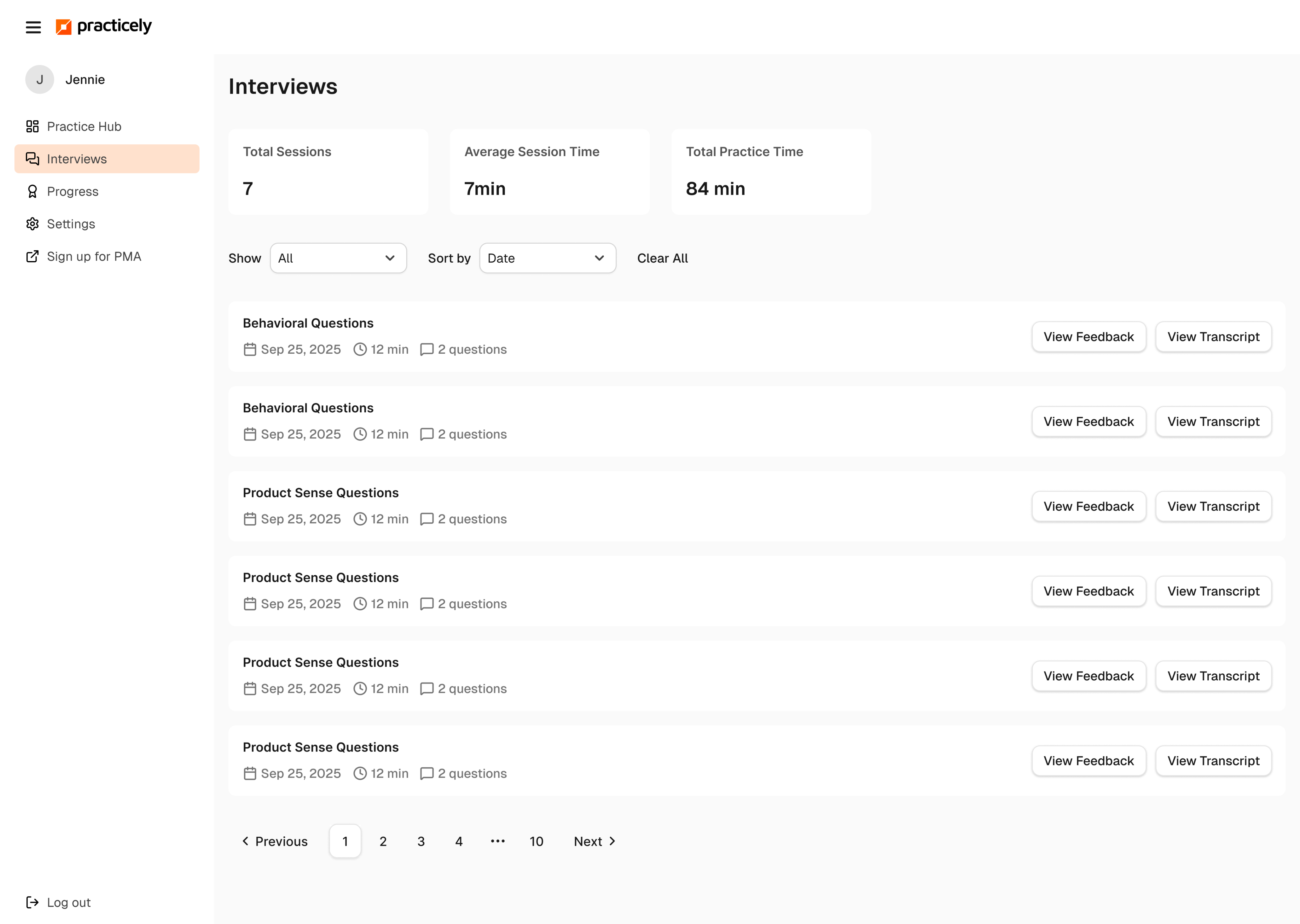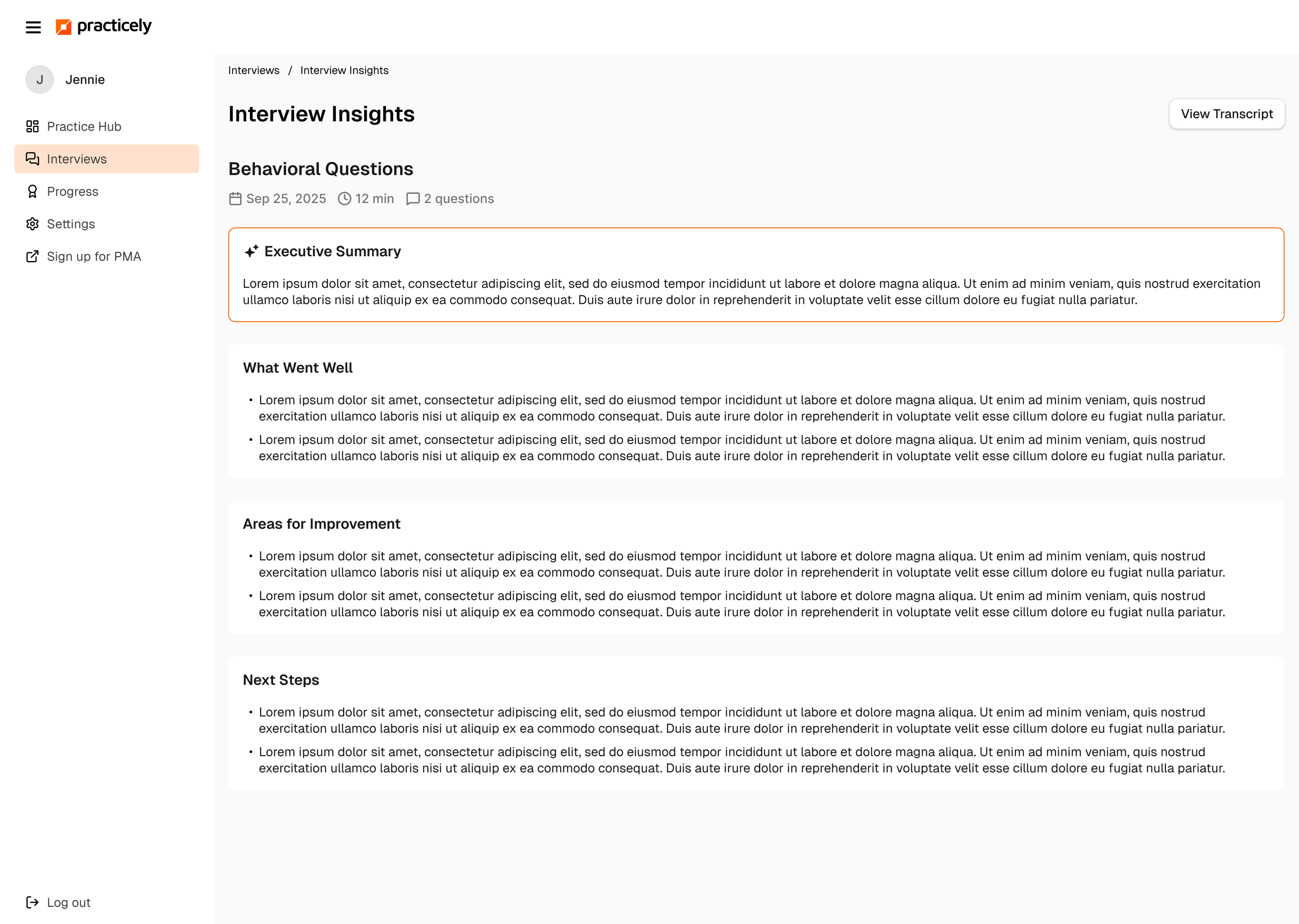 Practicely is an AI-powered interview preparation platform designed to help Product Managers get ready for interviews, by practicing Behavioral and Product Sense questions and receiving feedback.
